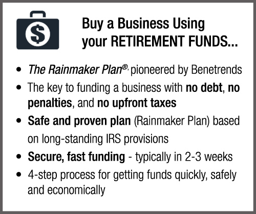 Funding is one of the most important components in buying a franchise/business. Benetrends has been funding America’s entrepreneurs for over 35 years, offering a comprehensive suite of funding options covering nearly every type of business situation. The most popular programs are the Rainmaker Plan® (IRA/Rollover) and SBA small business loan programs. And they continue to provide innovative solutions, with their newest funding option, The Rainmaker Advantage Plan®. This corporate capitalization strategy is designed to mitigate or eliminate the taxes due on the sale of a business. Benetrends also offers Securities Backed Line of Credit and Equipment Leasing.